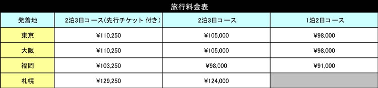 札幌発着コースは直行便のフライトの都合から2泊3日コースのみとなっております。