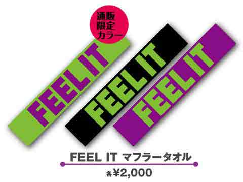“FEEL IT”が今回のカラー、緑と紫でプリントされたマフラータオルです。全3色展開。